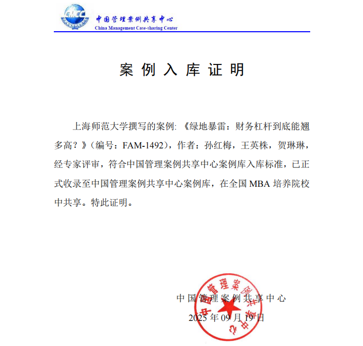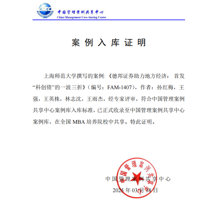 我院孙红梅教授撰写的两篇教学案例《德邦证券助力地方经济:首发“科创债”的一波三折》与《绿地暴雷:财务杠杆到底能翘多高?》成功入选中国管理案例共享中心案例库。